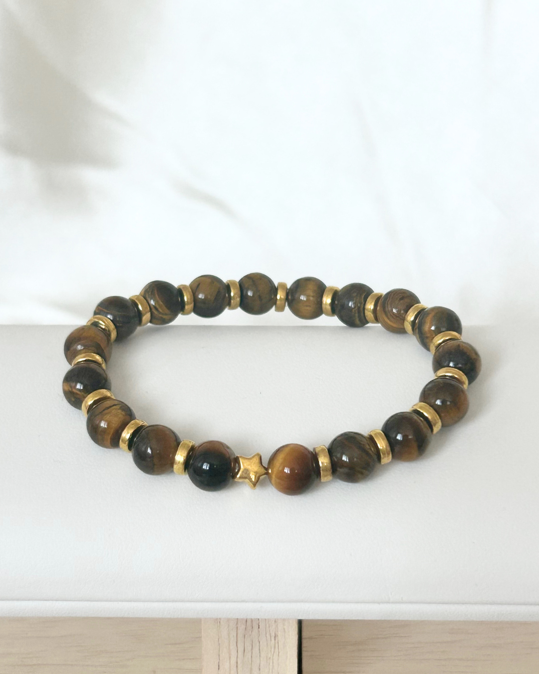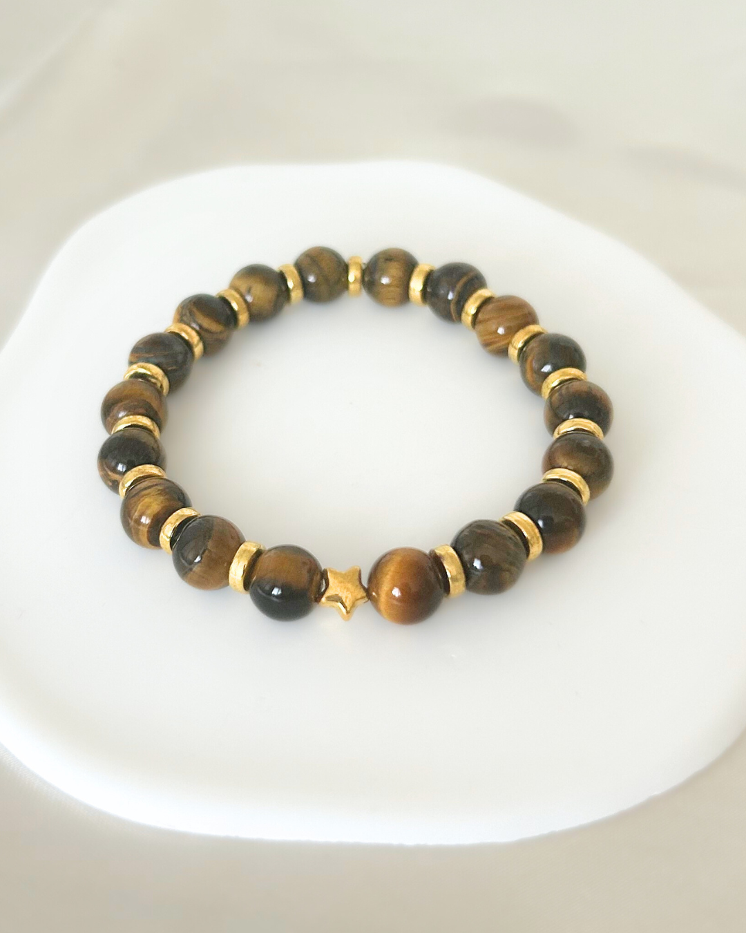 Tvorený z tigrieho oka a zdobený zlatou hviezdou, tento náramok vyžaruje stabilitu, odvahu a vnútorné svetlo. Tigrie oko posilňuje intuíciu a pomáha rozpoznať, kam duša smeruje. Je kameňom ochrany a zeme, ktorý spája fyzickú silu s duchovnou jasnozrivosťou – ako svetelný sprievodca na ceste poznania.